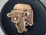 Die gegarten Maultaschen in dünne Scheiben schneiden. Die Frühlingszwiebeln waschen, putzen und in Ringe schneiden.