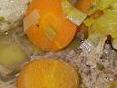 Petersilienwurzel, Sellerie, Lauch und eine große Karotte waschen, putzen und in Scheiben und Stücke schneiden. Das klein geschnittene Gemüse zum Fleisch geben. Die Zwiebel schälen, klein hacken und ebenfalls zugeben. Die Knoblauchzehe schälen und in die Suppe pressen.